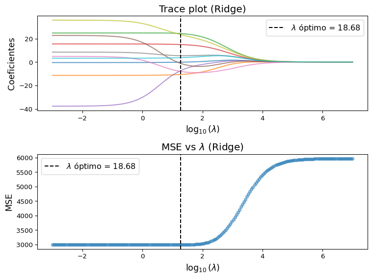 import numpy as npimport matplotlib.pyplot as pltfrom sklearn.datasets import load_diabetesfrom sklearn.linear_model import Ridge, RidgeCVfrom sklearn.model_selection import cross_val_scorefrom sklearn.preprocessing import StandardScaler# Datos:X, y = load_diabetes(return_X_y=True)scaler = StandardScaler()X = scaler.fit_transform(X) # Parámetro lambda:lambdas = np.logspace(-3, 7, 200) # Entrenamiento de Ridge:coefs = []for a in lambdas: ridge = Ridge(alpha=a, fit_intercept=True) ridge.fit(X, y) coefs.append(ridge.coef_)coefs = np.array(coefs)# MSE:mse_means = []for a in lambdas: ridge = Ridge(alpha=a) mse_scores =-cross_val_score(ridge, X, y, scoring="neg_mean_squared_error", cv=10) mse_means.append(mse_scores.mean())# Mejor lambda por CV:ridge_cv = RidgeCV(alphas=lambdas, cv=10, scoring="neg_mean_squared_error")ridge_cv.fit(X, y)best_lambda = ridge_cv.alpha_idx_best = np.where(lambdas == best_lambda)[0][0]mse_best = mse_means[idx_best]# 📈:plt.figure(figsize=(8, 6))# Trace plot:plt.subplot(2, 1, 1)plt.plot(np.log10(lambdas), coefs, alpha=0.7)plt.axvline(np.log10(best_lambda), color="k", ls="--", label=fr"$\lambda$ óptimo = {best_lambda:.2f}")plt.xlabel(r"$\log_{10}(\lambda)$", fontsize=13)plt.ylabel("Coeficientes", fontsize=13)plt.title("Trace plot (Ridge)", fontsize=15)plt.legend(fontsize=12, loc='upper right')# MSE vs lambda:plt.subplot(2, 1, 2)plt.scatter(np.log10(lambdas), mse_means, s=20, alpha=0.5)plt.axvline(np.log10(best_lambda), color="k", ls="--", label=fr"$\lambda$ óptimo = {best_lambda:.2f}")plt.xlabel(r"$\log_{10}(\lambda)$", fontsize=13)plt.ylabel("MSE", fontsize=13)plt.title(r"MSE vs $\lambda$ (Ridge)", fontsize=15)plt.legend(fontsize=12, loc='upper left')plt.tight_layout()plt.show()# 📋 (lambda óptimo):ridge_best = Ridge(alpha=best_lambda)ridge_best.fit(X, y)print(f"Coeficientes de Ridge con lambda óptimo (MSE = {mse_best:.2f}):")for i, coef inenumerate(ridge_best.coef_):print(f"θ_{i+1} = {coef:.2f}")