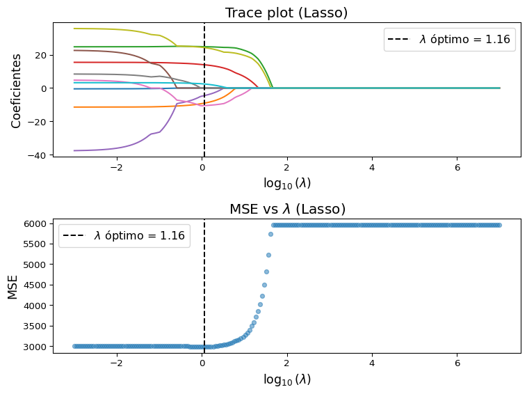 import numpy as npimport matplotlib.pyplot as pltfrom sklearn.datasets import load_diabetesfrom sklearn.linear_model import Lasso, LassoCVfrom sklearn.model_selection import cross_val_scorefrom sklearn.preprocessing import StandardScaler# Datos:X, y = load_diabetes(return_X_y=True)scaler = StandardScaler()X = scaler.fit_transform(X) # Parámetro lambda:lambdas = np.logspace(-3, 7, 200) # Entrenamiento de Lasso:coefs = []for a in lambdas: lasso = Lasso(alpha=a, fit_intercept=True, max_iter=5000) lasso.fit(X, y) coefs.append(lasso.coef_)coefs = np.array(coefs)# MSE:mse_means = []for a in lambdas: lasso = Lasso(alpha=a, max_iter=5000) mse_scores =-cross_val_score(lasso, X, y, scoring="neg_mean_squared_error", cv=10) mse_means.append(mse_scores.mean())# Mejor lambda por CV:lasso_cv = LassoCV(alphas=lambdas, cv=10, max_iter=5000)lasso_cv.fit(X, y)best_lambda = lasso_cv.alpha_idx_best = np.where(lambdas == best_lambda)[0][0]mse_best = mse_means[idx_best]# 📈:plt.figure(figsize=(8, 6))# Trace plot:plt.subplot(2, 1, 1)plt.plot(np.log10(lambdas), coefs)plt.axvline(np.log10(best_lambda), color="k", ls="--", label=fr"$\lambda$ óptimo = {best_lambda:.2f}")plt.xlabel(r"$\log_{10}(\lambda)$", fontsize=13)plt.ylabel("Coeficientes", fontsize=13)plt.title("Trace plot (Lasso)", fontsize=15)plt.legend(fontsize=12, loc='upper right')# MSE vs lambda:plt.subplot(2, 1, 2)plt.scatter(np.log10(lambdas), mse_means, s=20, alpha=0.5)plt.axvline(np.log10(best_lambda), color="k", ls="--", label=fr"$\lambda$ óptimo = {best_lambda:.2f}")plt.xlabel(r"$\log_{10}(\lambda)$", fontsize=13)plt.ylabel("MSE", fontsize=13)plt.title(r"MSE vs $\lambda$ (Lasso)", fontsize=15)plt.legend(fontsize=12, loc='upper left')plt.tight_layout()plt.show()# 📋 (lambda óptimo):lasso_best = Lasso(alpha=best_lambda, max_iter=5000)lasso_best.fit(X, y)print(f"Coeficientes de Lasso con lambda óptimo (MSE = {mse_best:.2f}):")for i, coef inenumerate(lasso_best.coef_):print(f"θ_{i+1} = {coef:.2f}")
